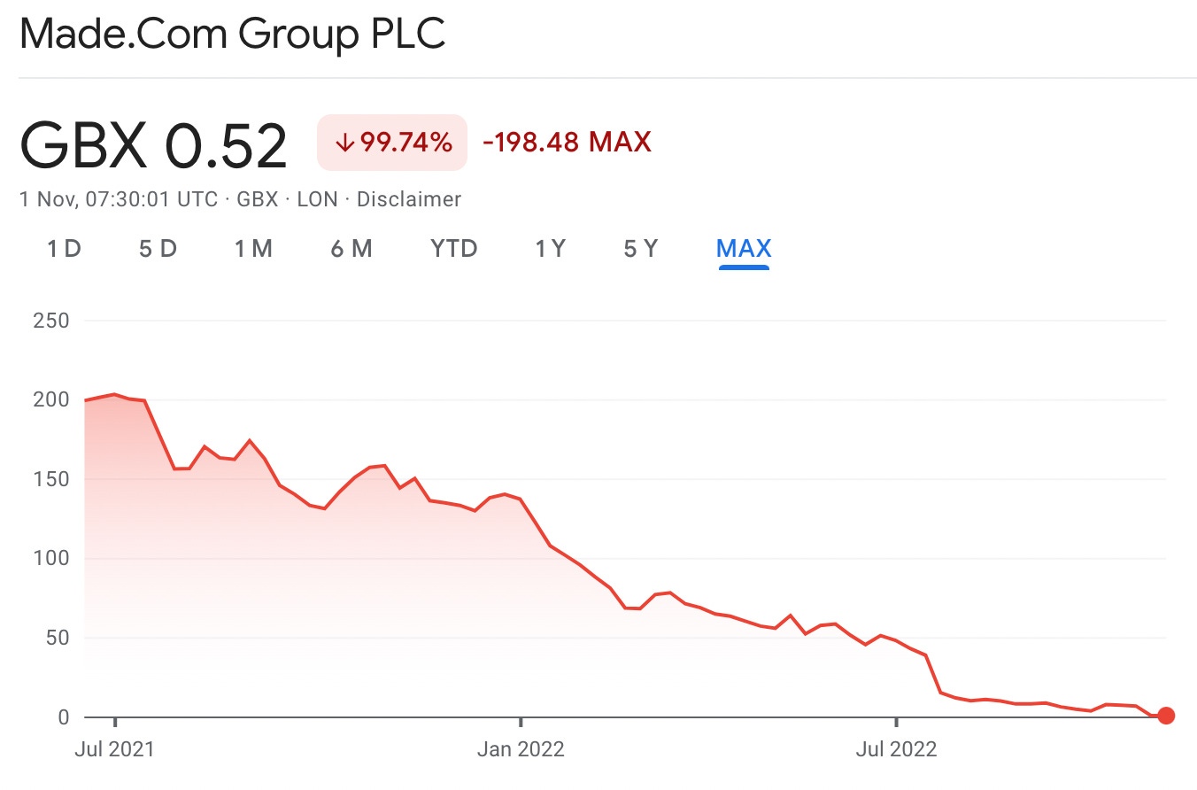 Next just bought Made.com, the collapsed online furniture retailer for £3.4 million ($3.9 million). Last year made.com was valued at £775 million ($909 million), after it floated on the stock market in June 2021. Since then, shares in Made.com have tumbled from a listing price of 200p to below 1p. Next has stepped in, collecting the broken parts of the furniture business, as all 573 of their staff are laid off and the majority of outstanding orders remain unfulfilled.